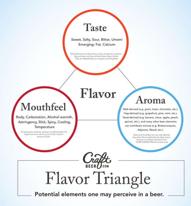 The CraftBeer.com Flavor Triangle demonstrates that flavor is more than just taste, it's a combination of taste, aroma and sensation on the palate that all work together to create an intensity that you perceive.